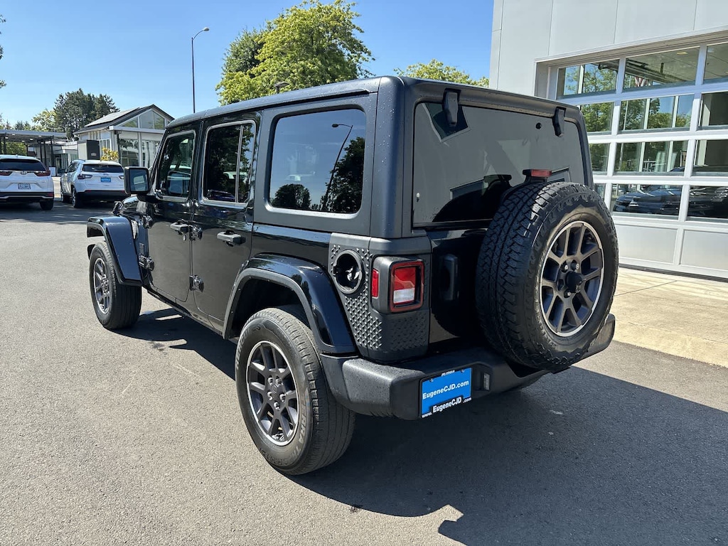QUICK ORDER PACKAGE 22Q 80TH EDITION Engine: 2.0L I4 DOHC DI Turbo w/ESS, Transmission: 8-Speed Automatic (850RE), Speed Sensitive Power Locks, Leather Wrapped Steering Wheel, Body Color Fender Flares, Front 1-Touch Down Power Windows, Bridgestone Brand Tires, Jeep 80th Anniversary Console Badge, 7.0 Touchscreen Display, Annodized Gunmetal I/P Bezels, Jeep 80th Anniversary Badges, Jeep 80th Swing Gate Plaque, Security Alarm, Berber Floor Mats w/80th Anniversary Tag, 8.4 Radio & Premium Audio Group (DISC), Emergency/Assistance Call, Rear View Auto Dim Mirror, Automatic Headlamps, 220 Amp Alternator, Light Tungsten Interior Accents, Google Android Auto®, Selectable Tire Fill Alert, SiriusXM Radio Service, For More Info, Call 800-643-2112, USB Host Flip, Integrated Center Stack Radio, Air, TRANSMISSION: 8-SPEED AUTOMATIC (850RE) Anti-Lock 4-Wheel Disc Brakes, BLACK 3-PIECE HARD TOP Freedom Panel Storage Bag, Rear Window Defroster, Rear Window Wiper/Washer, No Soft Top, ENGINE: 2.0L I4 DOHC DI TURBO W/ESS. Jeep Unlimited 80th Anniversary with Black Clearcoat exterior and Black interior features a 4 Cylinder Engine with 270 HP at 5250 RPM*.