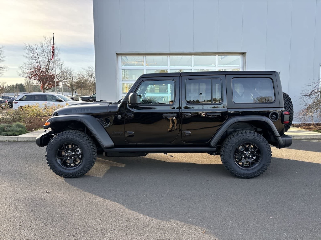QUICK ORDER PACKAGE 24W WILLYS 3.6L V6 24V VVT UPG I Engine w/ESS, 8-Speed Automatic 850RE Transmission, 7 & 4 Pin Wiring Harness, Conventional Differential Front Axle, 4-Wheel Drive Swing Gate Decal, Black Grille w/Gloss Black Rings, Injection Molded Black Rear Bumper, Dana M210 Wide HD Tube Front Axle, Daytime Running Lamps LED Accents, Front LED Fog Lamps, LED Premium Reflector Headlamps, E-Locker Rear Axle, Corning Gorilla Glass, Security Alarm, Class II Receiver Hitch, Mold In Color Bumper w/Gloss Black, Advanced Brake Assist, Automatic Headlamps, Off-Road Plus Mode, Willys Hood Decal, Full Speed Forward Collision Warning Plus, Rock Protection Sill Rails, Power Heated Mirrors, Enhanced Adaptive Cruise Control, Auxiliary Switches, Dana M220 Wide Rear Axle, Molded in Color Rubicon, 8-SPEED AUTOMATIC 850RE TRANSMISSION Adaptive Cruise Control w/Stop, Anti-Lock 4-Wheel Disc Brakes, Integrated Radar Camera Module (IRCM), Dana M200 Rear Axle, Selec-Speed Control, BLACK 3-PIECE HARD TOP Freedom Panel Storage Bag, Rear Window Defroster, Rear Window Wiper/Washer, SAFETY GROUP ParkSense Rear Park Assist System, Auto High Beam Headlamp Control, Blind Spot & Cross Path Detection, LED Taillamps, Injection Molded Black Rear Bumper, CONVENIENCE GROUP Emergency/Assistance Call, 2-Door Passive Entry, Front Door Locks, Cluster 7.0 TFT Color Display, Universal Garage Door Opener, Heated Front Seats, Air Conditioning w/Auto Temp Control, Heated Steering Wheel, Air Filtering, 3.6L V6 24V VVT UPG I ENGINE W/ESS Engine Oil Cooler (STD). Jeep Willys with Black Clearcoat exterior and Black interior features a V6 Cylinder Engine with 285 HP at 6400 RPM*.