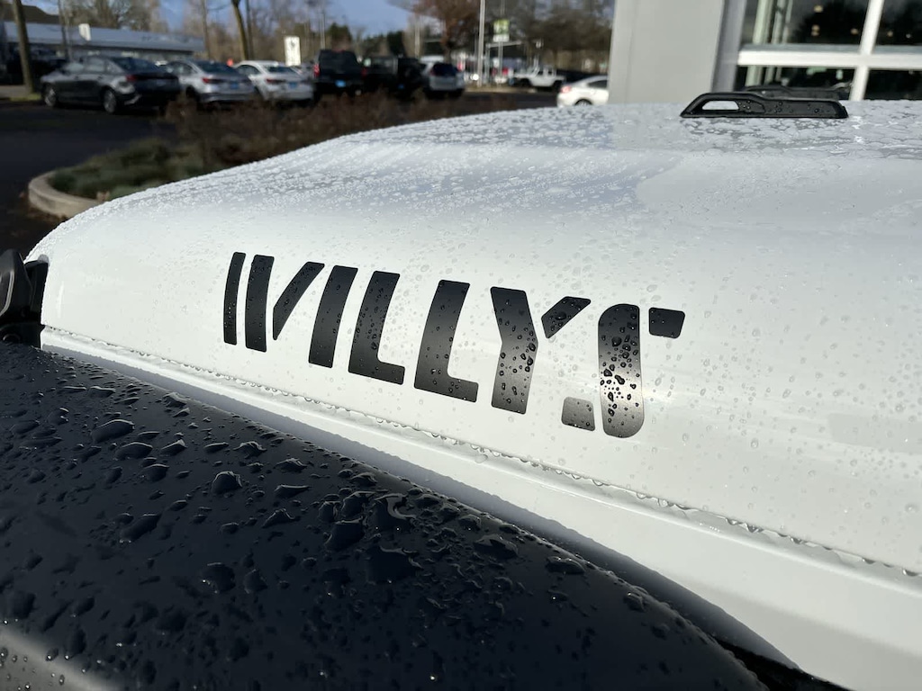 QUICK ORDER PACKAGE 23W WILLYS 3.6L V6 24V VVT UPG I Engine w/ESS, 6-Speed Manual Transmission, 7 & 4 Pin Wiring Harness, Conventional Differential Front Axle, Power Dome Dual Vented Hood, 4-Wheel Drive Swing Gate Decal, Black Grille w/Gloss Black Rings, Injection Molded Black Rear Bumper, Dana M210 Wide HD Tube Front Axle, Daytime Running Lamps LED Accents, Front LED Fog Lamps, LED Premium Reflector Headlamps, E-Locker Rear Axle, Corning Gorilla Glass, Security Alarm, Class II Receiver Hitch, Mold In Color Bumper w/Gloss Black, Advanced Brake Assist, Automatic Headlamps, Off-Road Plus Mode, Willys Hood Decal, Full Speed Forward Collision Warning Plus, Rock Protection Sill Rails, Power Heated Mirrors, Enhanced Adaptive Cruise Control, Auxiliary Switches, Dana M220 Wide Rear Axle, Molded in, BLACK 3-PIECE HARD TOP Freedom Panel Storage Bag, Rear Window Defroster, Rear Window Wiper/Washer, CONVENIENCE GROUP Emergency/Assistance Call, 2-Door Passive Entry, Front Door Locks, Cluster 7.0 TFT Color Display, Universal Garage Door Opener, Heated Front Seats, Air Conditioning w/Auto Temp Control, Heated Steering Wheel, Air Filtering, 6-SPEED MANUAL TRANSMISSION (STD), 3.6L V6 24V VVT UPG I ENGINE W/ESS (STD). Jeep Willys with Bright White Clearcoat exterior and Black interior features a V6 Cylinder Engine with 285 HP at 6400 RPM*.
